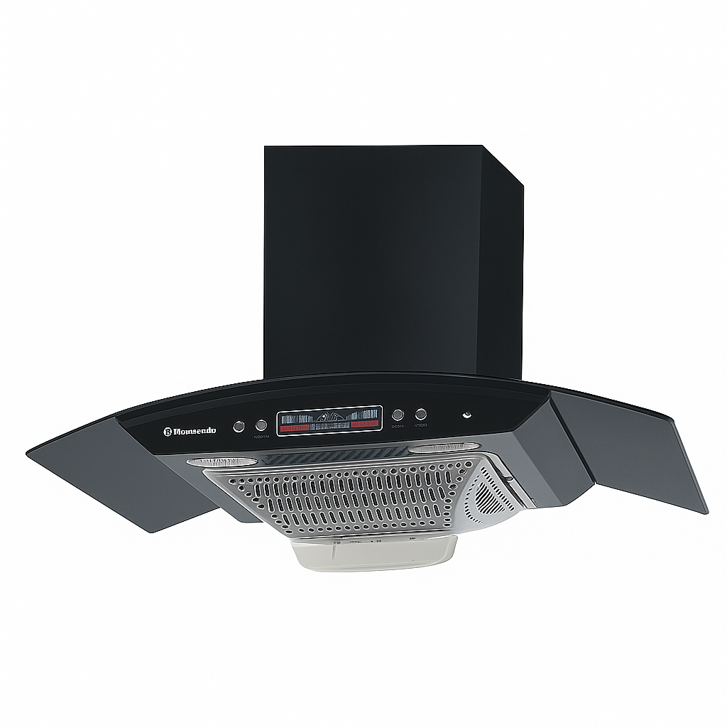 Sleek and powerful, this modern kitchen hood features a black glass panel with touch and gesture control for effortless use. Its 1000 m³/h suction and Heat Auto Clean system clear smoke fast, while triple baffle filters, a copper motor, and energy-saving LED lighting ensure quiet, long-lasting performance.
